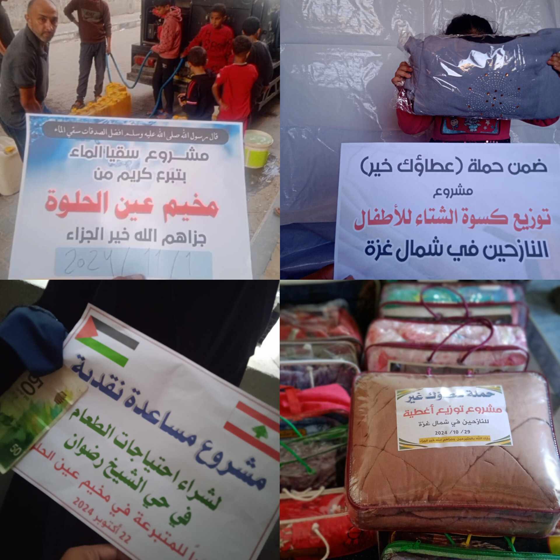 (سُقيا ماء _ توزيع الخبز _ طرود غذائية _ أغطية وكسوة شتوية _ طرد منظفات _ بامبرز أطفال _ مساعدات نقدية)