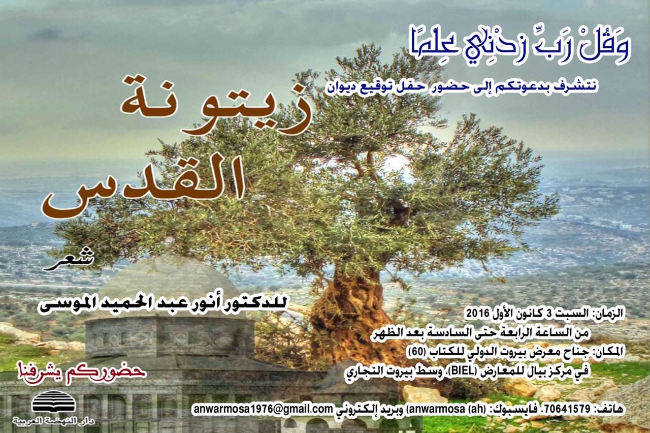 تنظم دار النهضة العربية بيروت، حفل توقيع ديوان زيتونة القدس، للشاعر الدكتور أنور الموسى، بين الرابعة والسادسة بعد ظهر السبت المقبل، في جناح الدار في معرض بيروت الدولي للكتاب( بيال)