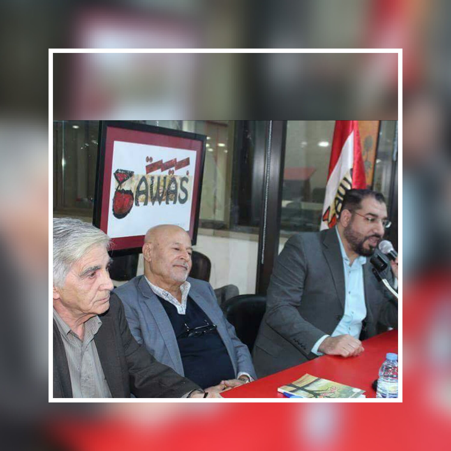 ثم كلمة لرئيس جمعية حواس الثقافية الفنان عبد الحليم حمود تحدث فيها عن الشاعر هزيمة كمناضل ، وسرد في سيرته الذاتية .