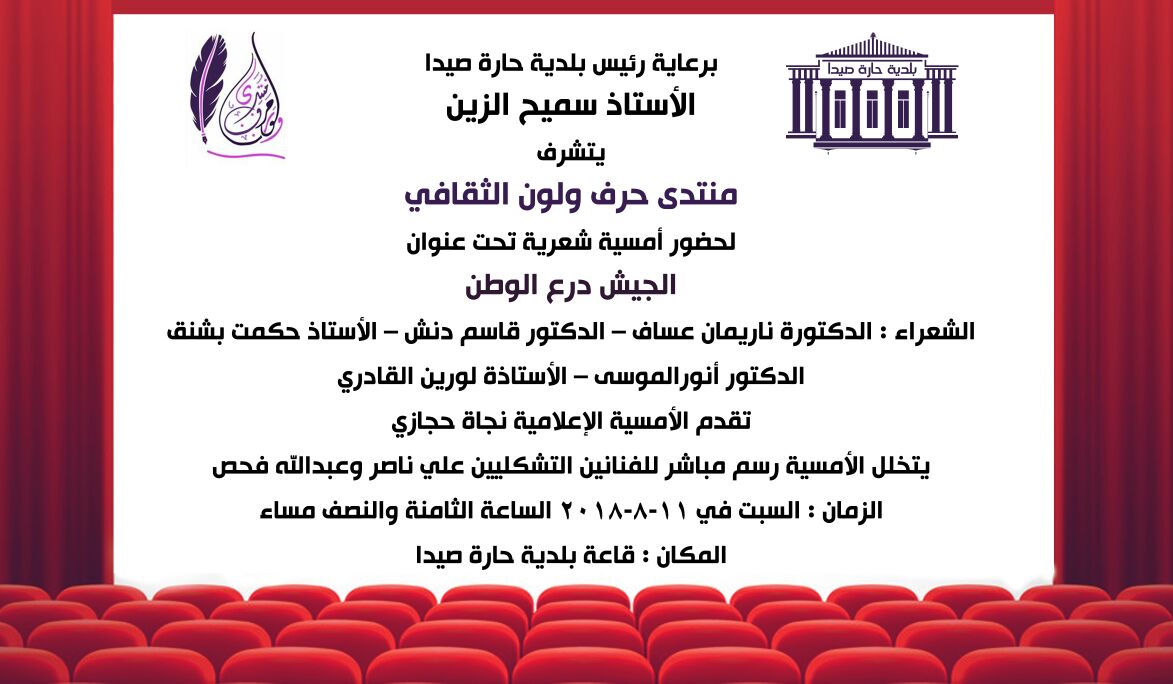 دعا منتدى حرف ولون، إلى حضور أمسية شعرية، تحت عنوان -(الجيش درع الوطن) ، برعاية رئيس بلدية حارة صيدا الأستاذ سميح الزين الثامنة ونصف مساء السبت 11 آب المقبل، في قاعة بلدية حارة صيدا.